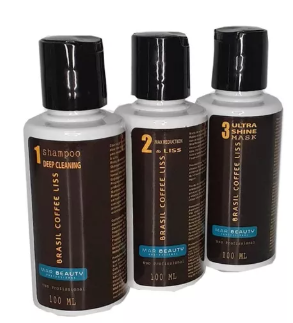 Kit Brasil Coffee Liss; es un alisado de 3 pasos, de 100ml; a base de café, sin formol ni derivados, está compuesto por ácido láctico y cítrico el cual elimina frizz y volumen.